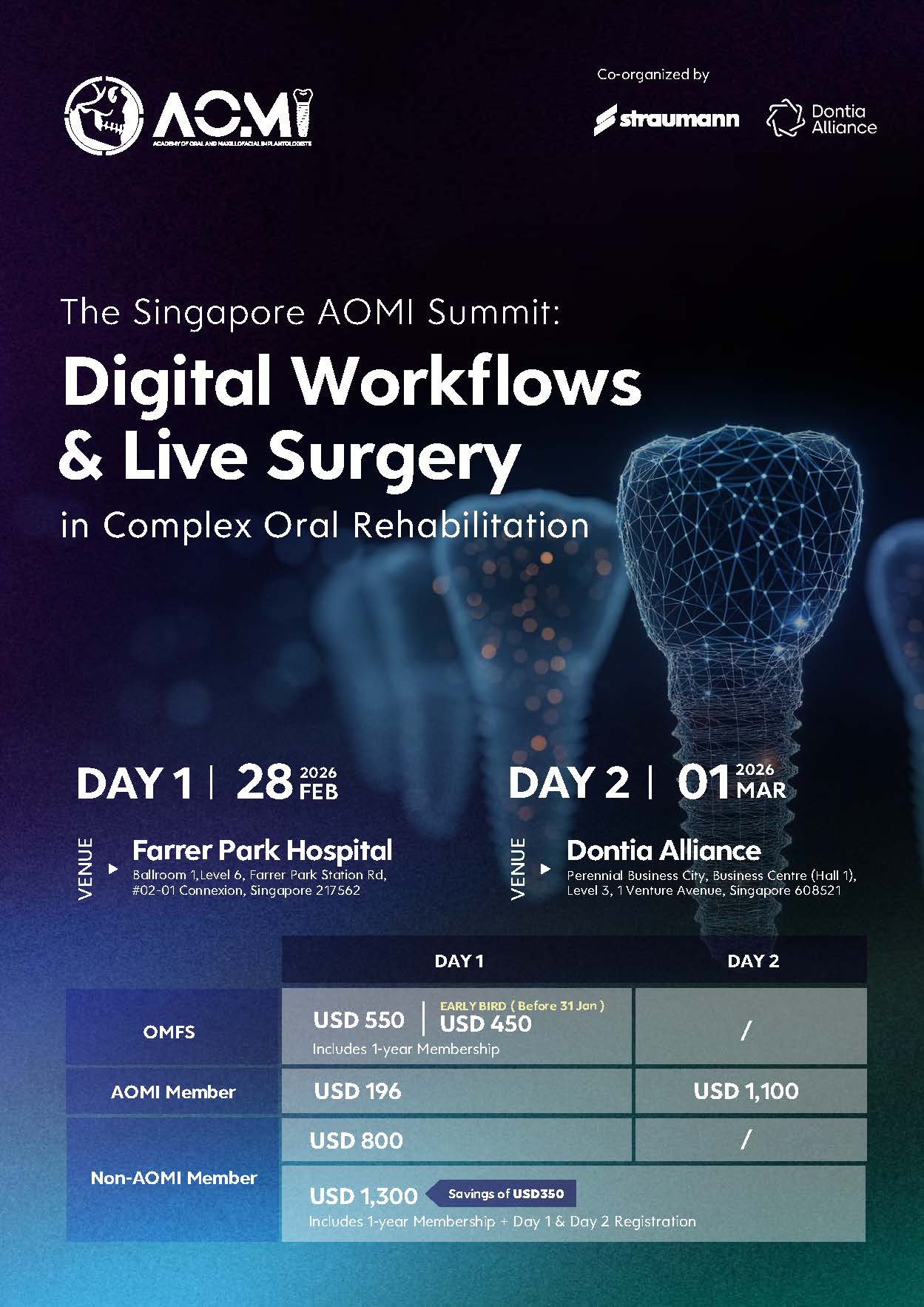 The Academy of Oral and Maxillofacial Implantologists (AOMI) is proud to launch its Singapore Chapter with a premier global summit, co-organized with Straumann and Dontia Alliance. This two-day intensive event brings together an international faculty of AOMI Board members to deliver a comprehensive masterclass in complex oral rehabilitation, blending advanced theory, digital innovation, and live surgical demonstration.